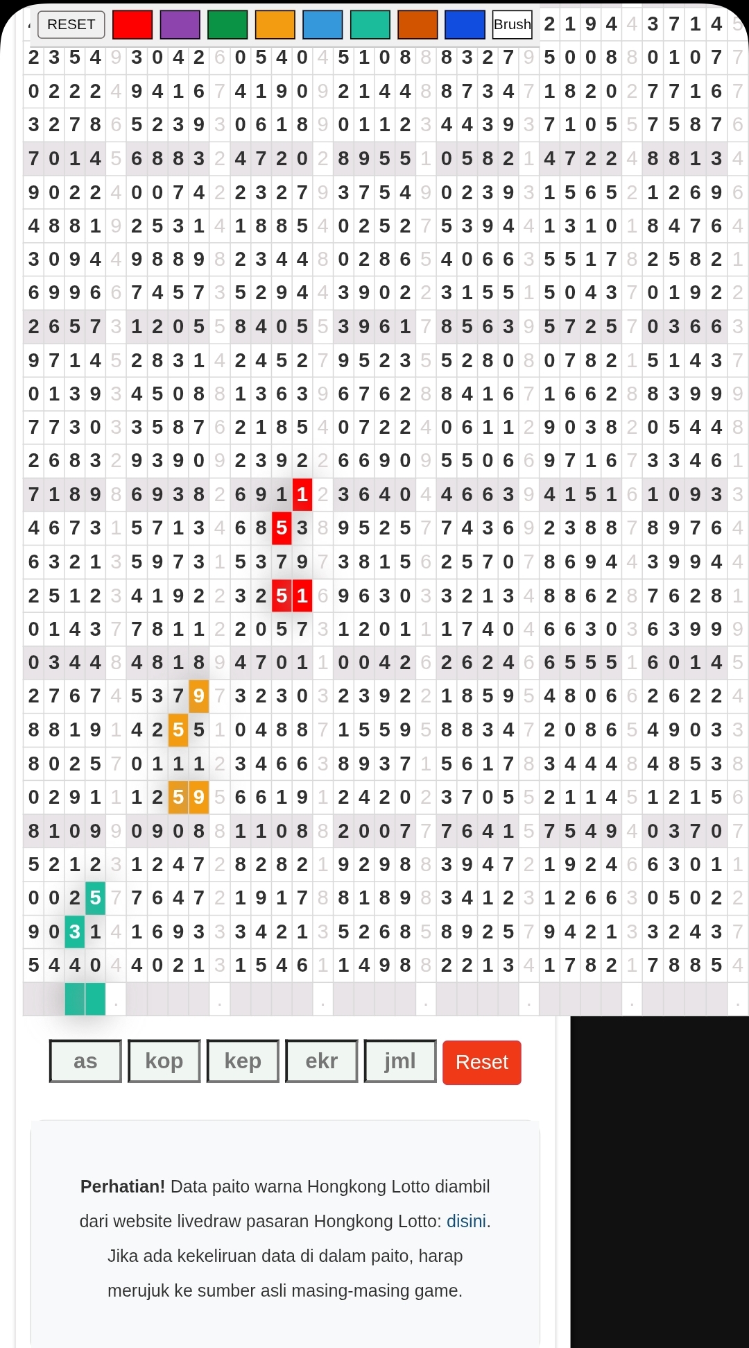 | Rumus Angka Mati berdasarkan kepala harian | 05 06 08 09 16 17 19 20 21 26 27 28 29 30 31 32 37 38 39 40 41 43 48 49 51 52 54 59 63 64 65 74 75 76 85 86 87 97 98 |