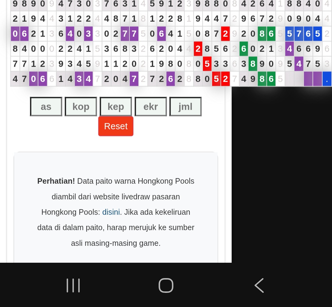 | Rumus Angka Mati berdasarkan kepala harian | 04 05 06 07 08 09 10 15 16 17 18 19 21 26 27 28 29 30 32 37 39 41 42 43 52 53 54 63 64 65 75 76 83 84 86 87 94 95 97 |