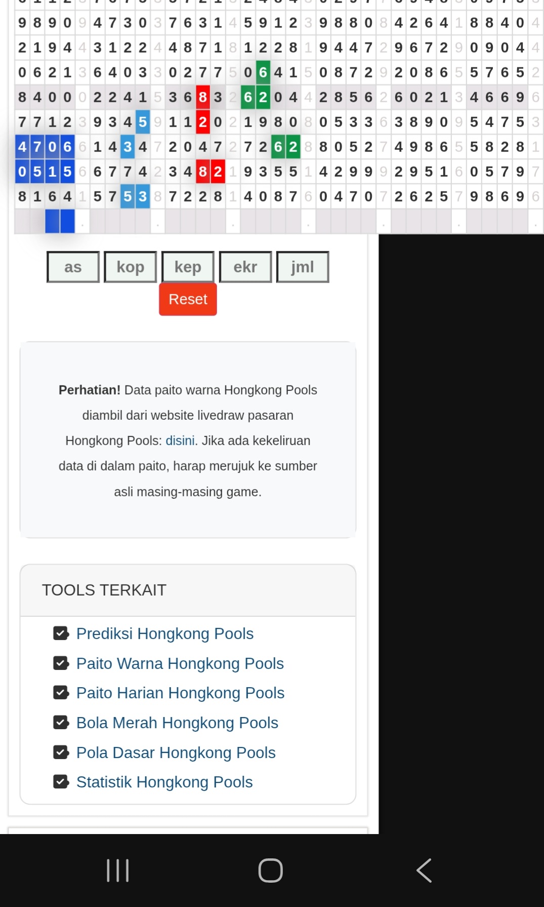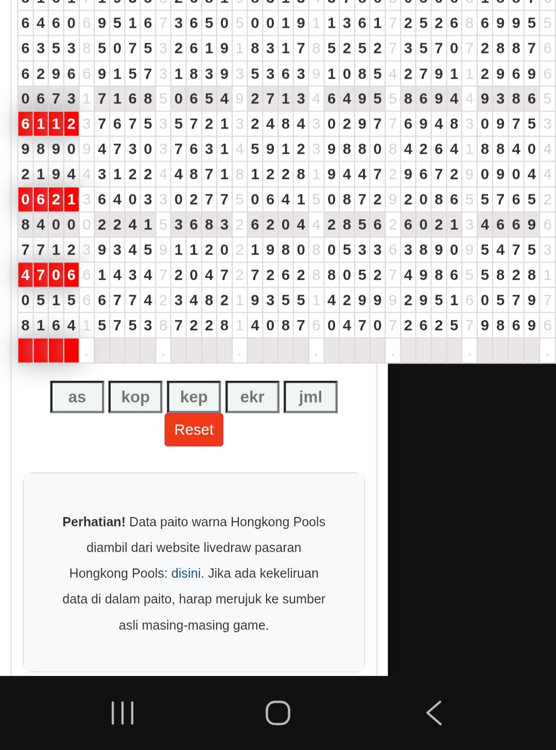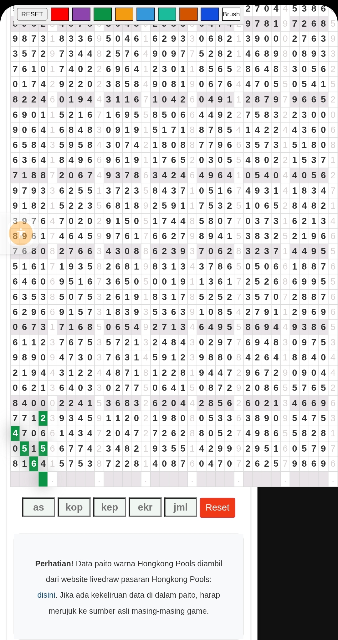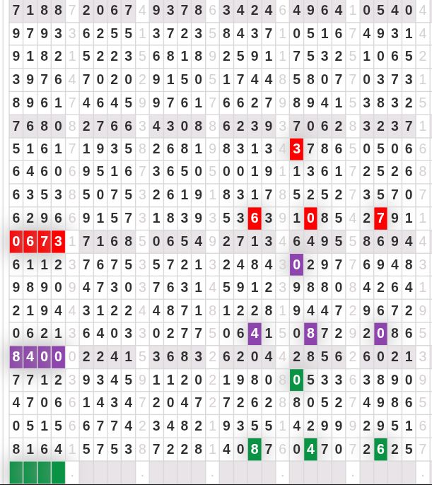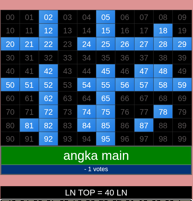 | Rumus Angka Mati berdasarkan kepala harian | 04 05 06 07 08 09 10 15 16 17 18 21 26 28 29 30 31 32 41 42 43 52 53 54 64 65 72 73 75 76 83 84 86 93 94 95 96 97 98 |