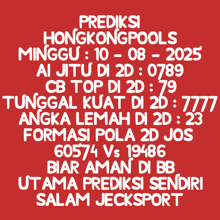 Selamat Bergabung kembali bersama angkanet dalam room Prediksi HK. Untuk kenyamanan dalam berprediksi, kami melarang adanya posting nomor WA, Web atau FB. Angkanet juga tidak pernah menjual prediksi, software, atau aplikasi togel lainnya. Berprediksilah secara damai dan elegan. Terima kasih telah menjadi pengunjung setia angkanet