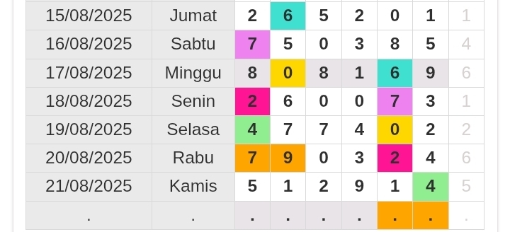 | Rumus Angka Mati berdasarkan kepala harian | 07 08 09 10 18 19 20 21 29 31 32 40 42 43 49 50 51 53 60 61 62 63 64 65 71 72 73 74 75 76 82 83 84 85 87 93 95 96 98 |
