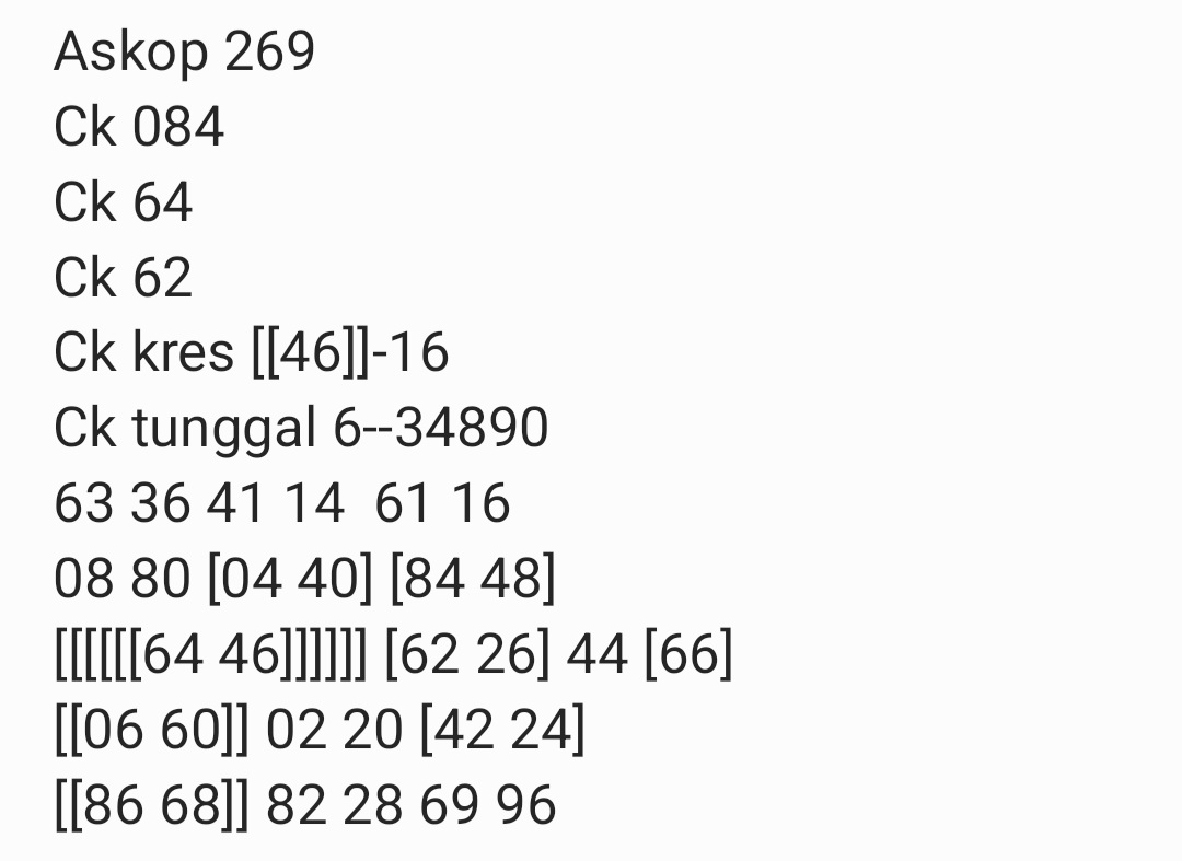 | Rumus Angka Mati berdasarkan kepala harian | 04 05 06 07 08 09 10 15 16 17 18 19 21 26 27 28 29 30 32 37 39 41 42 43 52 53 54 63 64 65 75 76 83 84 86 87 94 95 97 |