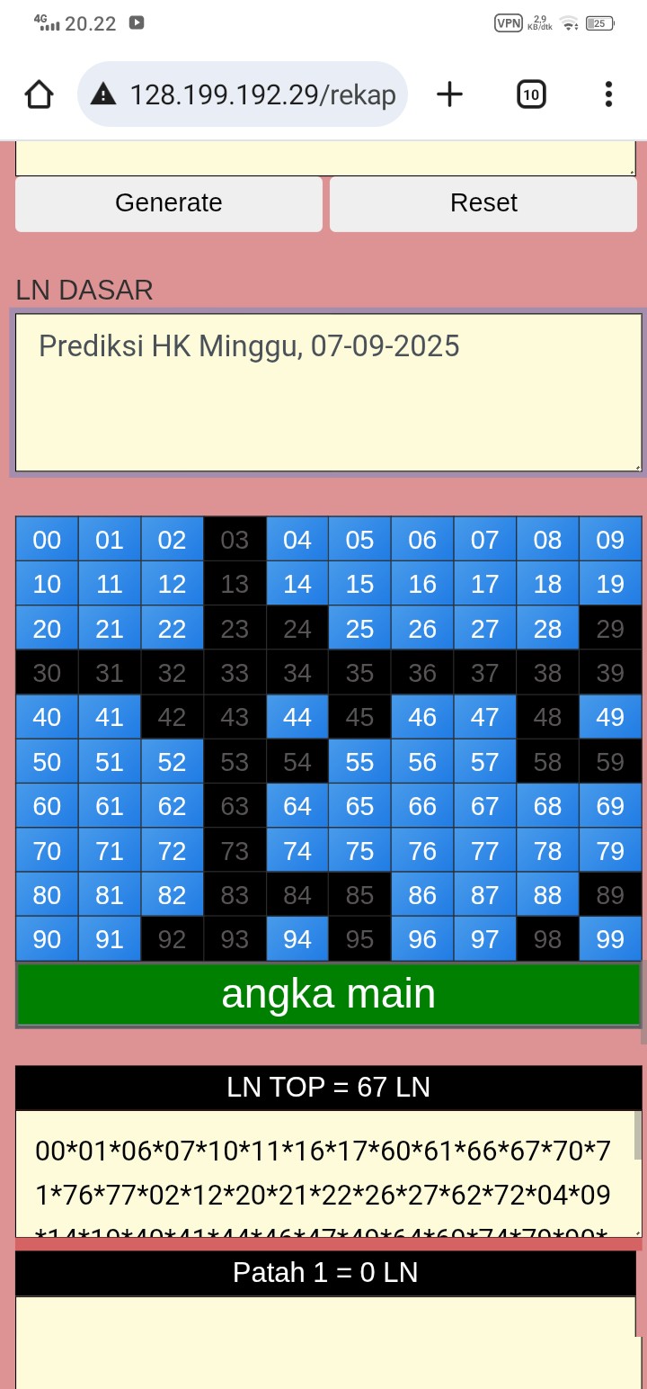 | Rumus Angka Mati berdasarkan kepala harian | 04 05 06 07 08 09 10 15 16 17 18 19 21 26 27 28 29 30 32 37 39 41 42 43 52 53 54 63 64 65 75 76 83 84 86 87 94 95 97 |