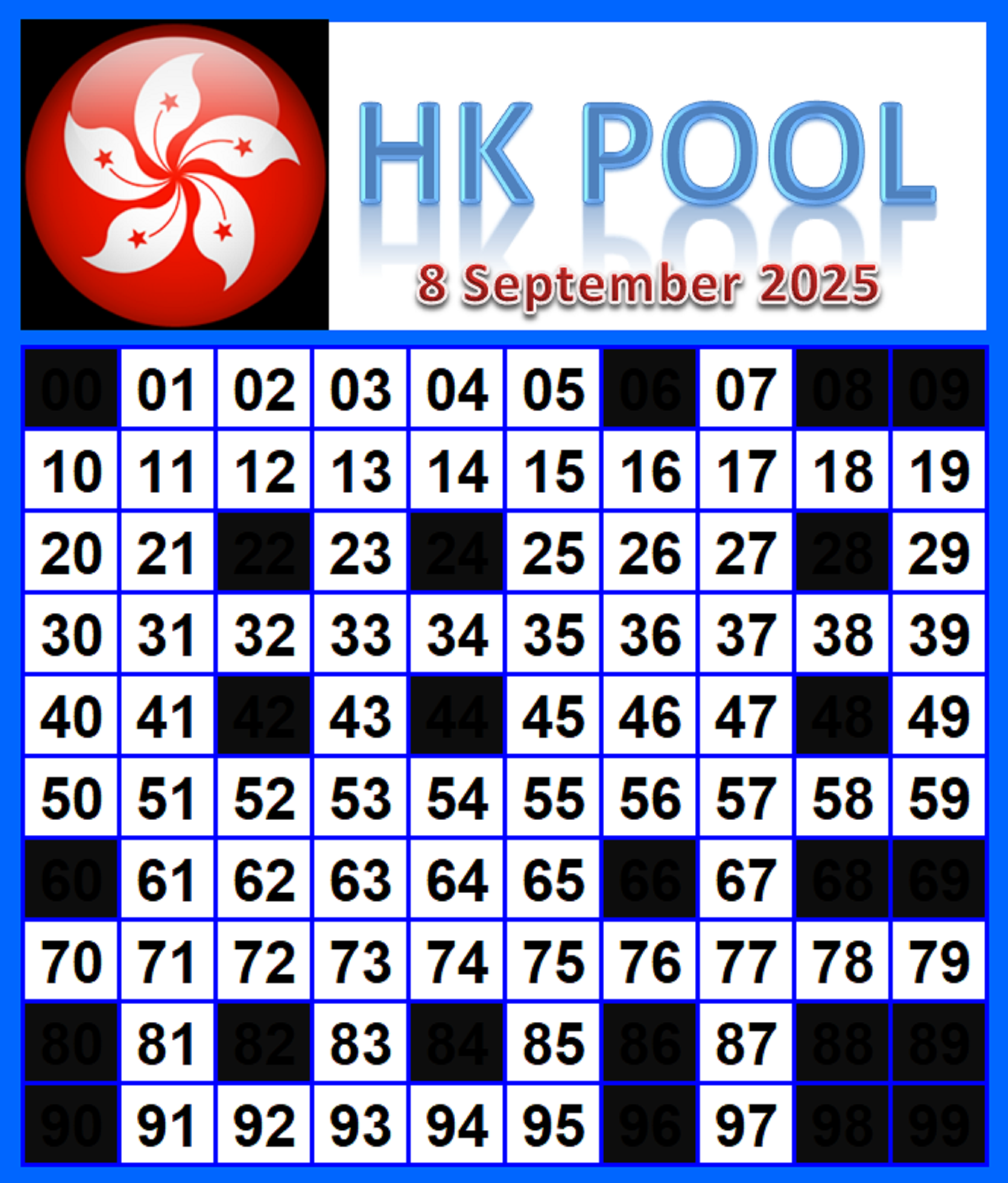 | Rumus Angka Mati berdasarkan kepala harian | 04 05 06 07 08 09 10 15 16 17 18 21 26 28 29 30 31 32 41 42 43 52 53 54 64 65 72 73 75 76 83 84 86 93 94 95 96 97 98 |