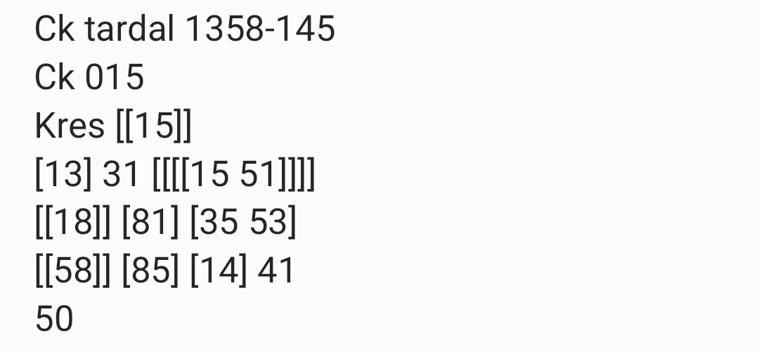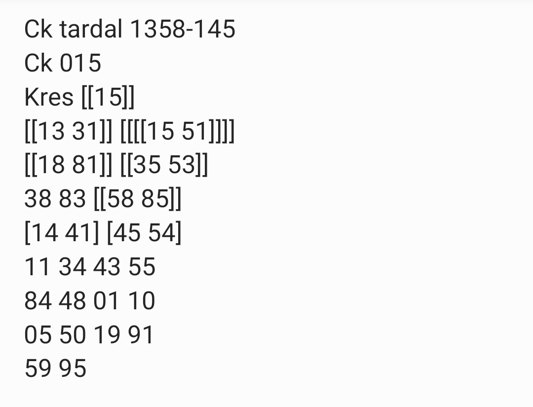 | Rumus Angka Mati berdasarkan kepala harian | 04 05 06 07 09 10 15 17 18 20 21 29 30 31 32 41 42 43 53 54 61 62 64 65 72 73 75 82 83 84 85 86 87 93 94 95 96 97 98 |