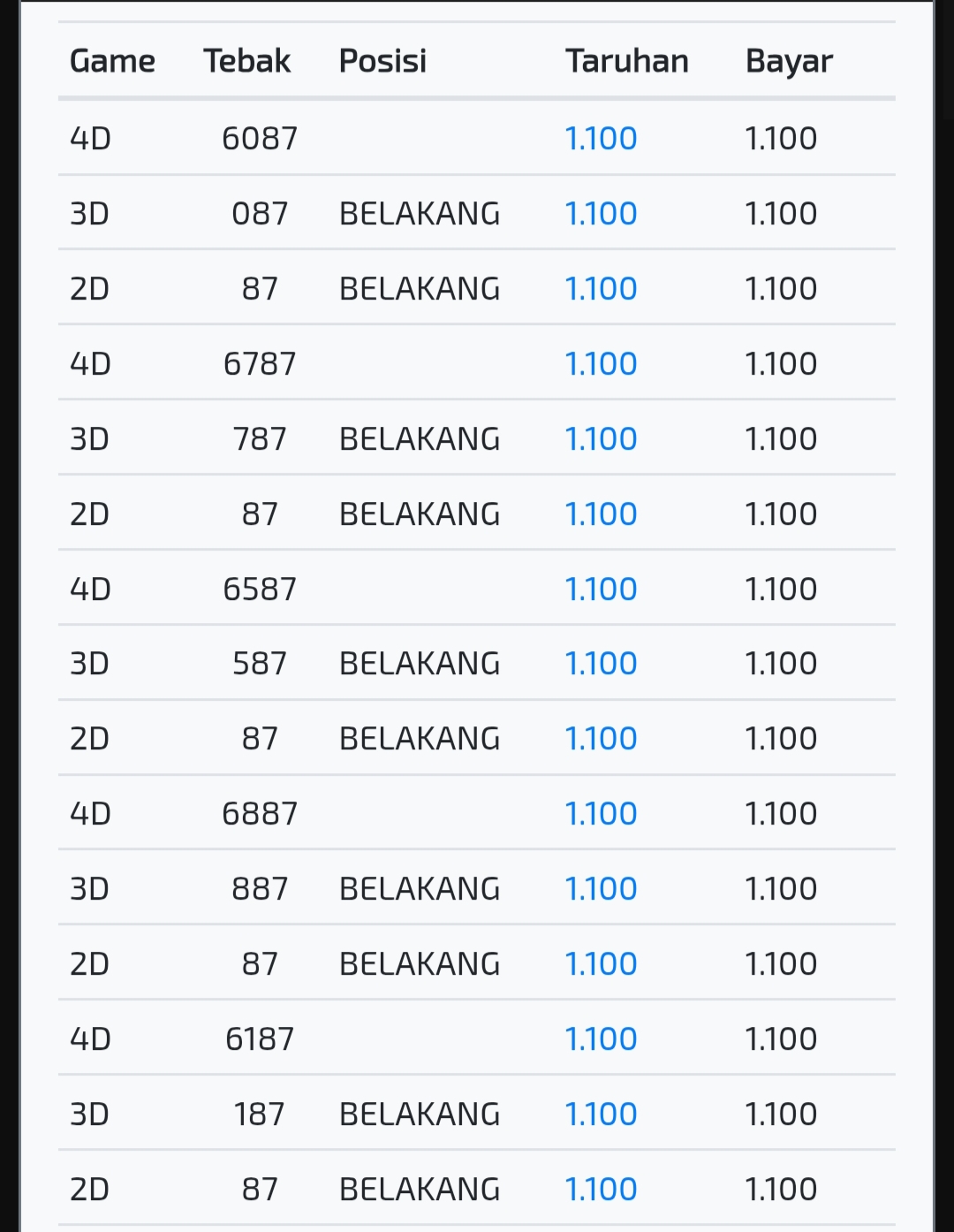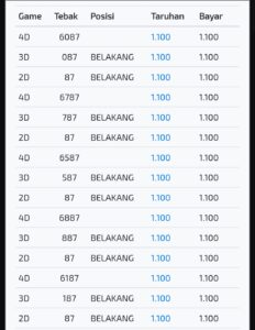 | Rumus Angka Mati berdasarkan kepala harian | 04 05 06 07 09 10 15 17 18 20 21 29 30 31 32 41 42 43 53 54 61 62 64 65 72 73 75 82 83 84 85 86 87 93 94 95 96 97 98 |