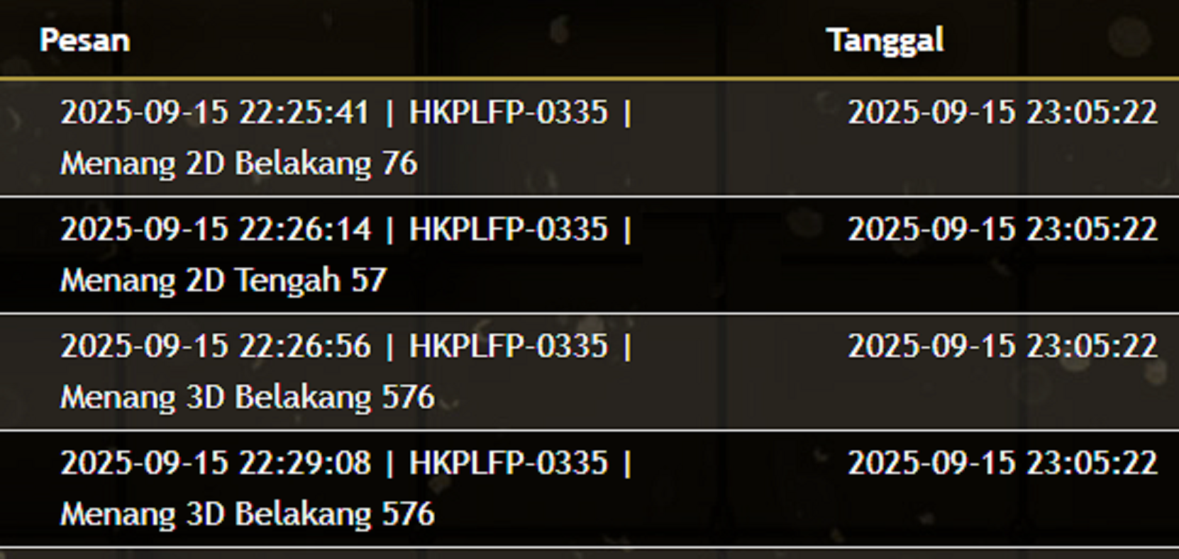 | Rumus Kontrol 4 berdasarkan kepala harian | 1456890 2345789 |