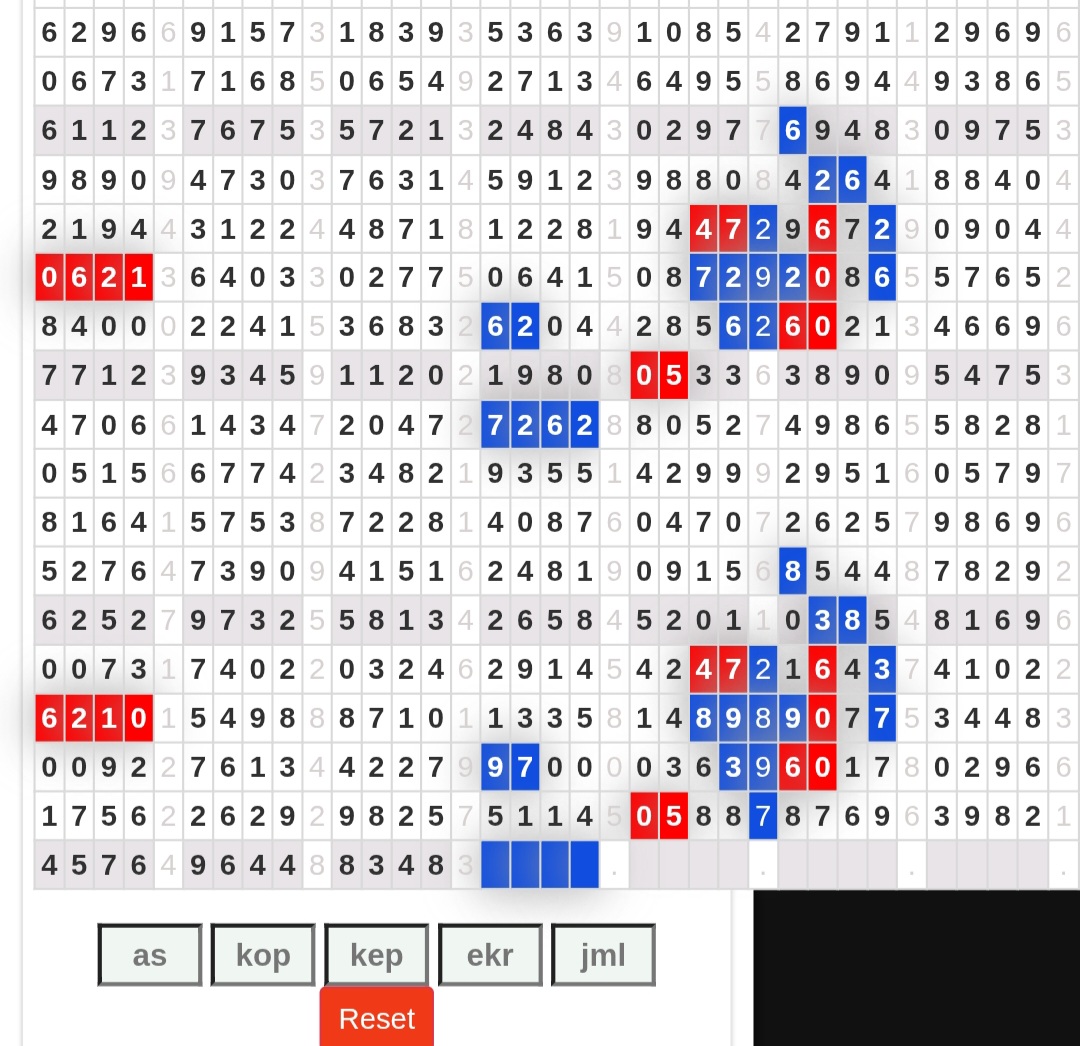 | Rumus Angka Mati berdasarkan kepala harian | 07 08 09 10 19 20 21 27 28 31 38 39 40 41 42 43 48 49 50 51 52 53 54 59 60 61 62 63 65 71 73 74 76 85 86 87 96 97 98 |