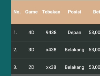 | Rumus Angka Mati berdasarkan kepala harian | 05 06 08 09 16 17 19 20 21 26 27 28 29 30 31 32 37 38 39 40 41 43 48 49 51 52 54 59 63 64 65 74 75 76 85 86 87 97 98 |