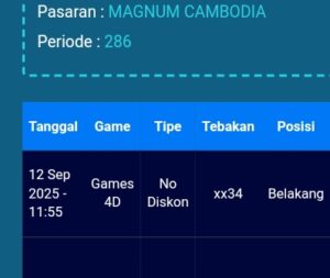 Prediksi Magnum Cambodia Kamis, 15-01-2026 Merupakan Prediksi Otomatis yang menggabungkan Metode Kalender Togel Dengan LN Generator yang akurasi prediksinya sudah kita ketahui bersama. Jadi harap Maklum Jika kadang meleset Prediksi Magnum Cambodia kita. Jadikan ini sebagai perbandingan saja dan tetap Utamakan karya sendiri