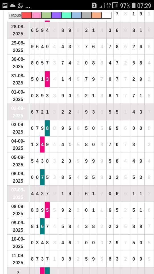 | Rumus Angka Mati berdasarkan kepala harian | 04 05 06 07 09 10 15 17 18 20 21 29 30 31 32 41 42 43 53 54 61 62 64 65 72 73 75 82 83 84 85 86 87 93 94 95 96 97 98 |