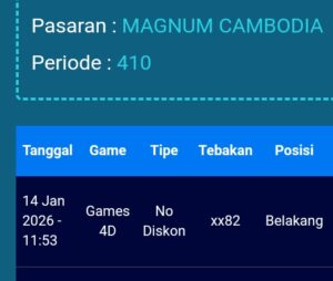 Prediksi Magnum Cambodia Kamis, 15-01-2026 Merupakan Prediksi Otomatis yang menggabungkan Metode Kalender Togel Dengan LN Generator yang akurasi prediksinya sudah kita ketahui bersama. Jadi harap Maklum Jika kadang meleset Prediksi Magnum Cambodia kita. Jadikan ini sebagai perbandingan saja dan tetap Utamakan karya sendiri