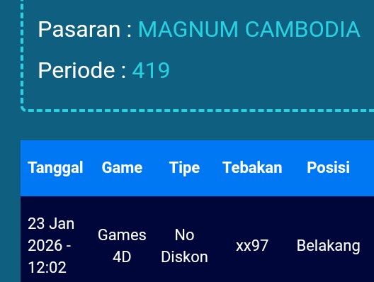Prediksi Magnum Cambodia Jumat, 02-01-2026 Merupakan Prediksi Otomatis yang menggabungkan Metode Kalender Togel Dengan LN Generator yang akurasi prediksinya sudah kita ketahui bersama. Jadi harap Maklum Jika kadang meleset Prediksi Magnum Cambodia kita. Jadikan ini sebagai perbandingan saja dan tetap Utamakan karya sendiri