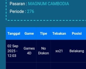 Prediksi Magnum Cambodia Kamis, 15-01-2026 Merupakan Prediksi Otomatis yang menggabungkan Metode Kalender Togel Dengan LN Generator yang akurasi prediksinya sudah kita ketahui bersama. Jadi harap Maklum Jika kadang meleset Prediksi Magnum Cambodia kita. Jadikan ini sebagai perbandingan saja dan tetap Utamakan karya sendiri