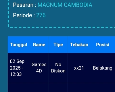 Selamat Bergabung kembali bersama angkanet dalam room Prediksi Magnum Cambodia. Untuk kenyamanan dalam berprediksi, kami melarang adanya posting nomor WA, Web atau FB. Angkanet juga tidak pernah menjual prediksi, software, atau aplikasi togel lainnya. Berprediksilah secara damai dan elegan. Terima kasih telah menjadi pengunjung setia angkanet