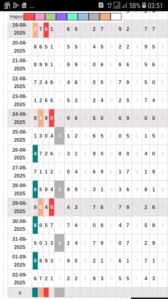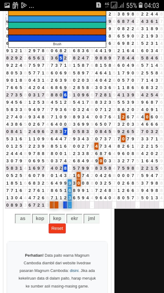 | Rumus Angka Mati berdasarkan kepala harian | 04 05 06 07 09 10 15 17 18 20 21 29 30 31 32 41 42 43 53 54 61 62 64 65 72 73 75 82 83 84 85 86 87 93 94 95 96 97 98 |