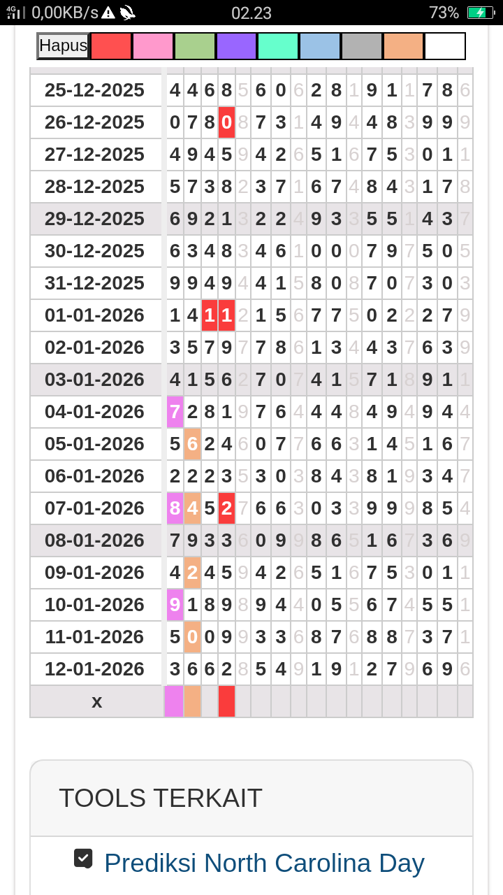 Prediksi North Carolina Day Kamis, 15-01-2026 Merupakan Prediksi Otomatis yang menggabungkan Metode Kalender Togel Dengan LN Generator yang akurasi prediksinya sudah kita ketahui bersama. Jadi harap Maklum Jika kadang meleset Prediksi North Carolina Day kita. Jadikan ini sebagai perbandingan saja dan tetap Utamakan karya sendiri