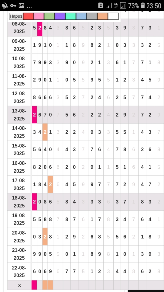 | Rumus Angka Mati berdasarkan kepala harian | 05 06 08 09 16 17 19 20 21 26 27 28 29 30 31 32 37 38 39 40 41 43 48 49 51 52 54 59 63 64 65 74 75 76 85 86 87 97 98 |