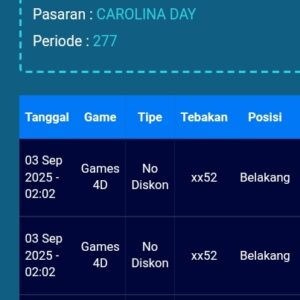 Prediksi North Carolina Day Kamis, 15-01-2026 Merupakan Prediksi Otomatis yang menggabungkan Metode Kalender Togel Dengan LN Generator yang akurasi prediksinya sudah kita ketahui bersama. Jadi harap Maklum Jika kadang meleset Prediksi North Carolina Day kita. Jadikan ini sebagai perbandingan saja dan tetap Utamakan karya sendiri