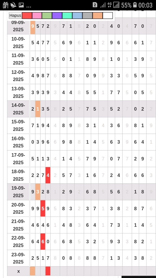 | Rumus Angka Mati berdasarkan kepala harian | 04 05 06 07 09 10 15 17 18 20 21 29 30 31 32 41 42 43 53 54 61 62 64 65 72 73 75 82 83 84 85 86 87 93 94 95 96 97 98 |