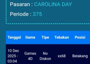 Prediksi North Carolina Day Minggu, 28-12-2025 Merupakan Prediksi Otomatis yang menggabungkan Metode Kalender Togel Dengan LN Generator yang akurasi prediksinya sudah kita ketahui bersama. Jadi harap Maklum Jika kadang meleset Prediksi North Carolina Day kita. Jadikan ini sebagai perbandingan saja dan tetap Utamakan karya sendiri