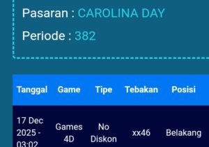 Prediksi North Carolina Day Jumat, 26-12-2025 Merupakan Prediksi Otomatis yang menggabungkan Metode Kalender Togel Dengan LN Generator yang akurasi prediksinya sudah kita ketahui bersama. Jadi harap Maklum Jika kadang meleset Prediksi North Carolina Day kita. Jadikan ini sebagai perbandingan saja dan tetap Utamakan karya sendiri
