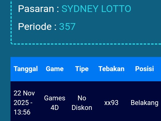Prediksi Sydney Lotto Jumat, 16-01-2026 Merupakan Prediksi Otomatis yang menggabungkan Metode Kalender Togel Dengan LN Generator yang akurasi prediksinya sudah kita ketahui bersama. Jadi harap Maklum Jika kadang meleset Prediksi Sydney Lotto kita. Jadikan ini sebagai perbandingan saja dan tetap Utamakan karya sendiri