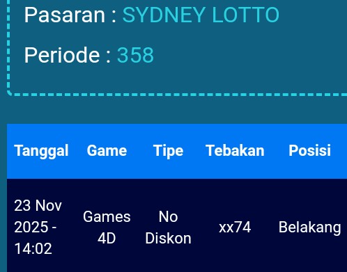Prediksi Sydney Lotto Jumat, 16-01-2026 Merupakan Prediksi Otomatis yang menggabungkan Metode Kalender Togel Dengan LN Generator yang akurasi prediksinya sudah kita ketahui bersama. Jadi harap Maklum Jika kadang meleset Prediksi Sydney Lotto kita. Jadikan ini sebagai perbandingan saja dan tetap Utamakan karya sendiri