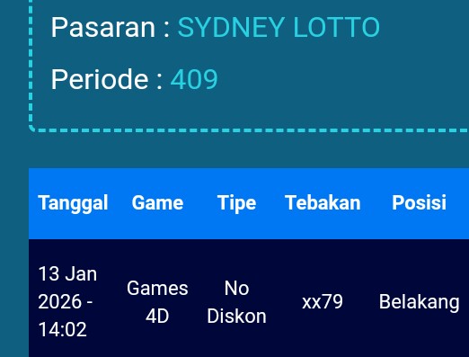 Prediksi Sydney Lotto Rabu, 14-01-2026 Merupakan Prediksi Otomatis yang menggabungkan Metode Kalender Togel Dengan LN Generator yang akurasi prediksinya sudah kita ketahui bersama. Jadi harap Maklum Jika kadang meleset Prediksi Sydney Lotto kita. Jadikan ini sebagai perbandingan saja dan tetap Utamakan karya sendiri