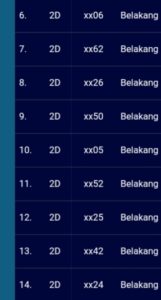 | Rumus Angka Mati berdasarkan kepala harian | 07 08 09 10 19 20 21 27 28 31 38 39 40 41 42 43 48 49 50 51 52 53 54 59 60 61 62 63 65 71 73 74 76 85 86 87 96 97 98 |