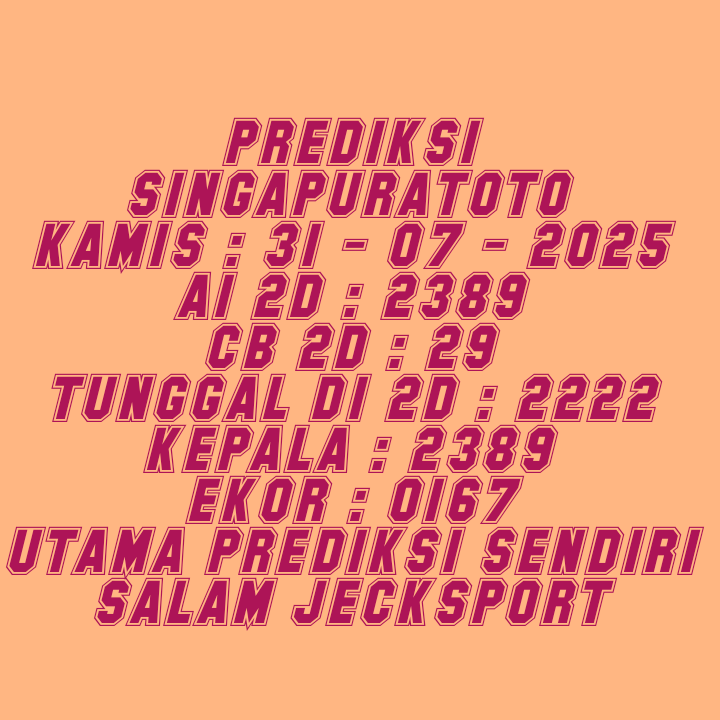 Prediksi Singapore Sabtu, 10-01-2026 Merupakan Prediksi Otomatis yang menggabungkan Metode Kalender Togel Dengan LN Generator yang akurasi prediksinya sudah kita ketahui bersama. Jadi harap Maklum Jika kadang meleset Prediksi Singapore kita. Jadikan ini sebagai perbandingan saja dan tetap Utamakan karya sendiri