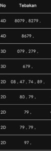 | Rumus Angka Mati berdasarkan kepala harian | 04 05 06 07 08 09 10 15 16 17 18 19 21 26 27 28 29 30 32 37 39 41 42 43 52 53 54 63 64 65 75 76 83 84 86 87 94 95 97 |