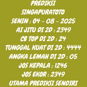 Prediksi Singapore Rabu, 14-01-2026 Merupakan Prediksi Otomatis yang menggabungkan Metode Kalender Togel Dengan LN Generator yang akurasi prediksinya sudah kita ketahui bersama. Jadi harap Maklum Jika kadang meleset Prediksi Singapore kita. Jadikan ini sebagai perbandingan saja dan tetap Utamakan karya sendiri