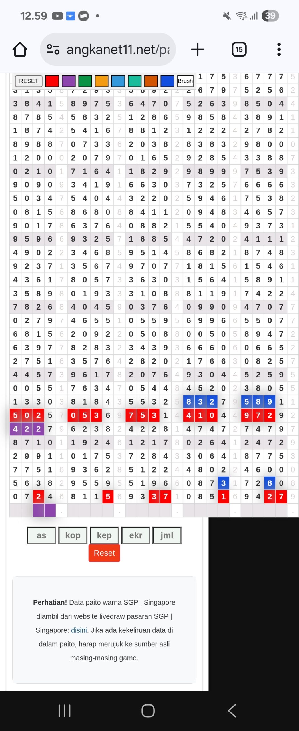 | Rumus Angka Mati berdasarkan kepala harian | 04 05 06 07 08 09 10 15 16 17 18 19 21 26 27 28 29 30 32 37 39 41 42 43 52 53 54 63 64 65 75 76 83 84 86 87 94 95 97 |