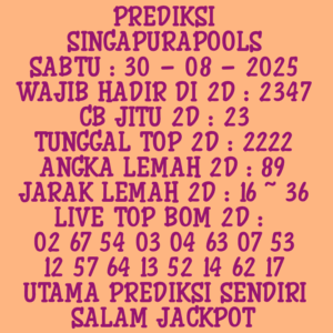 Prediksi Singapore Sabtu, 17-01-2026 Merupakan Prediksi Otomatis yang menggabungkan Metode Kalender Togel Dengan LN Generator yang akurasi prediksinya sudah kita ketahui bersama. Jadi harap Maklum Jika kadang meleset Prediksi Singapore kita. Jadikan ini sebagai perbandingan saja dan tetap Utamakan karya sendiri