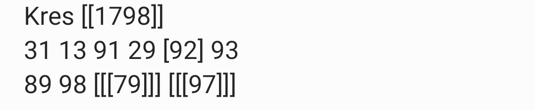 | Rumus Angka Mati berdasarkan kepala harian | 07 08 09 10 18 19 20 21 31 32 38 39 40 42 49 50 51 52 53 54 59 60 61 62 63 64 65 71 72 73 74 76 82 84 85 87 96 97 98 |