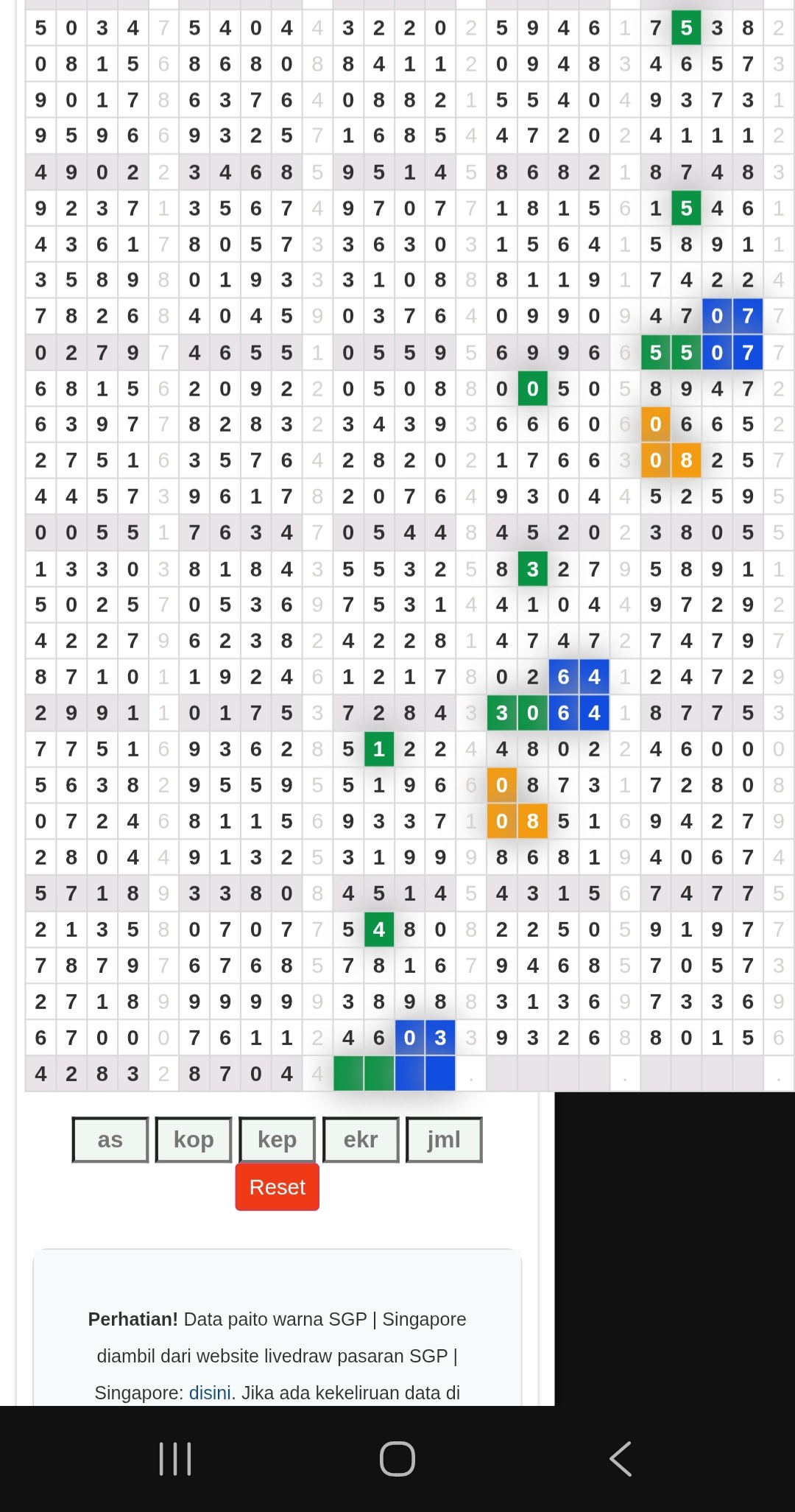 | Rumus Angka Mati berdasarkan kepala harian | 04 05 06 07 09 10 15 17 18 20 21 29 30 31 32 41 42 43 53 54 61 62 64 65 72 73 75 82 83 84 85 86 87 93 94 95 96 97 98 |