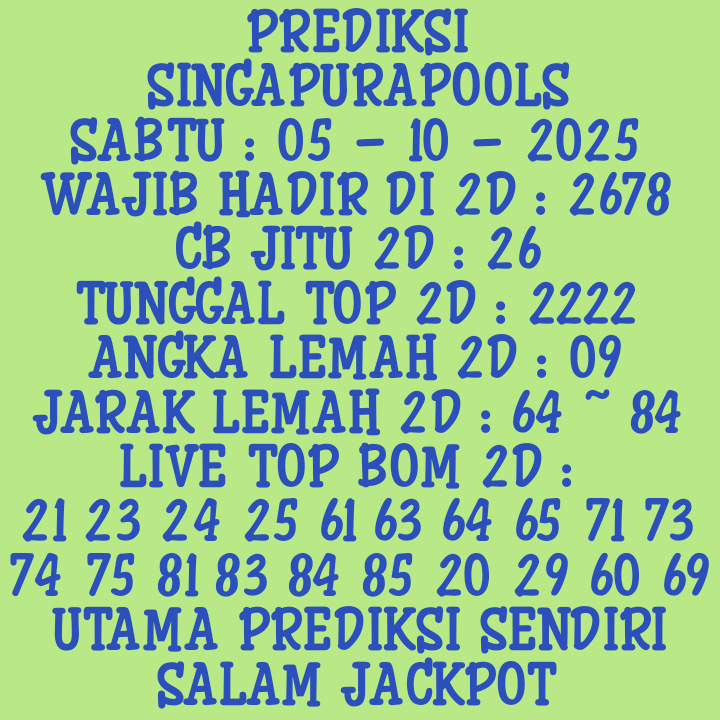 Prediksi Singapore Rabu, 21-01-2026 Merupakan Prediksi Otomatis yang menggabungkan Metode Kalender Togel Dengan LN Generator yang akurasi prediksinya sudah kita ketahui bersama. Jadi harap Maklum Jika kadang meleset Prediksi Singapore kita. Jadikan ini sebagai perbandingan saja dan tetap Utamakan karya sendiri