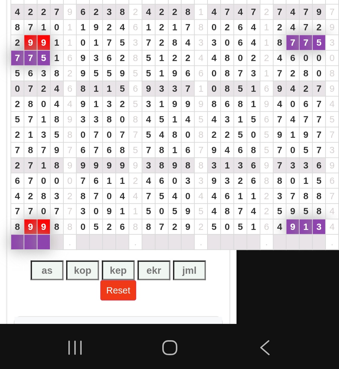 | Rumus Angka Mati berdasarkan kepala harian | 07 08 09 10 19 20 21 27 28 31 38 39 40 41 42 43 48 49 50 51 52 53 54 59 60 61 62 63 65 71 73 74 76 85 86 87 96 97 98 |