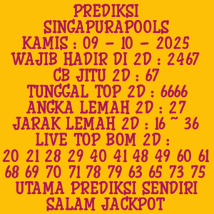 Prediksi Singapore Kamis, 15-01-2026 Merupakan Prediksi Otomatis yang menggabungkan Metode Kalender Togel Dengan LN Generator yang akurasi prediksinya sudah kita ketahui bersama. Jadi harap Maklum Jika kadang meleset Prediksi Singapore kita. Jadikan ini sebagai perbandingan saja dan tetap Utamakan karya sendiri