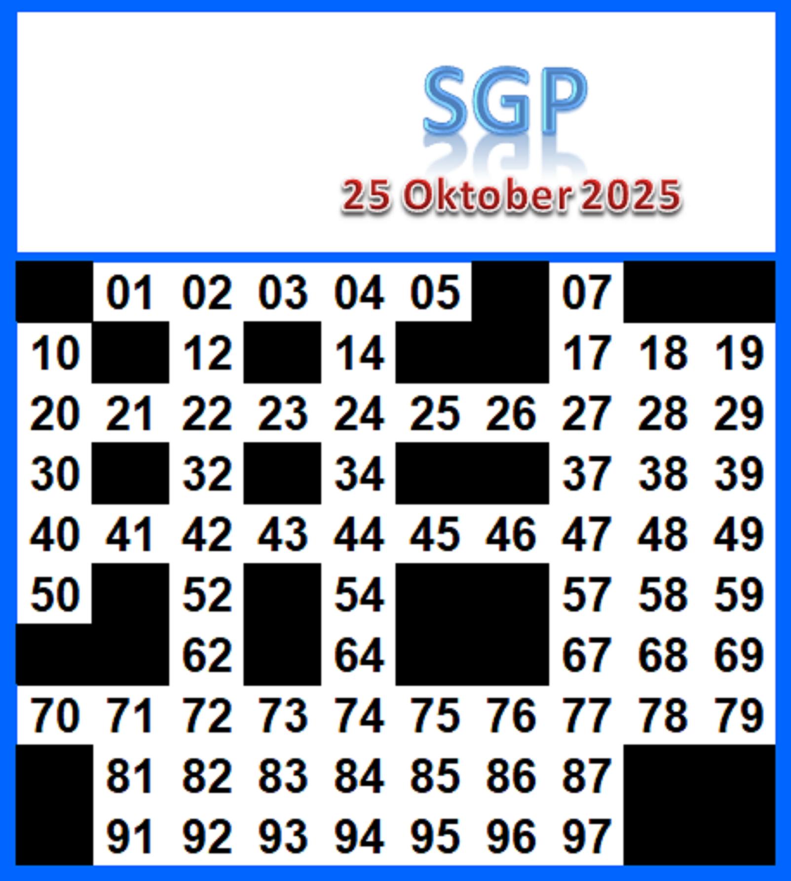| Rumus Angka Mati berdasarkan kepala harian | 04 05 06 07 08 09 10 15 16 17 18 19 21 26 27 28 29 30 32 37 39 41 42 43 52 53 54 63 64 65 75 76 83 84 86 87 94 95 97 |