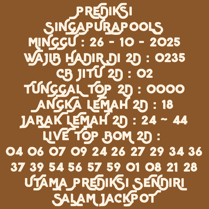 Prediksi Singapore Minggu, 18-01-2026 Merupakan Prediksi Otomatis yang menggabungkan Metode Kalender Togel Dengan LN Generator yang akurasi prediksinya sudah kita ketahui bersama. Jadi harap Maklum Jika kadang meleset Prediksi Singapore kita. Jadikan ini sebagai perbandingan saja dan tetap Utamakan karya sendiri