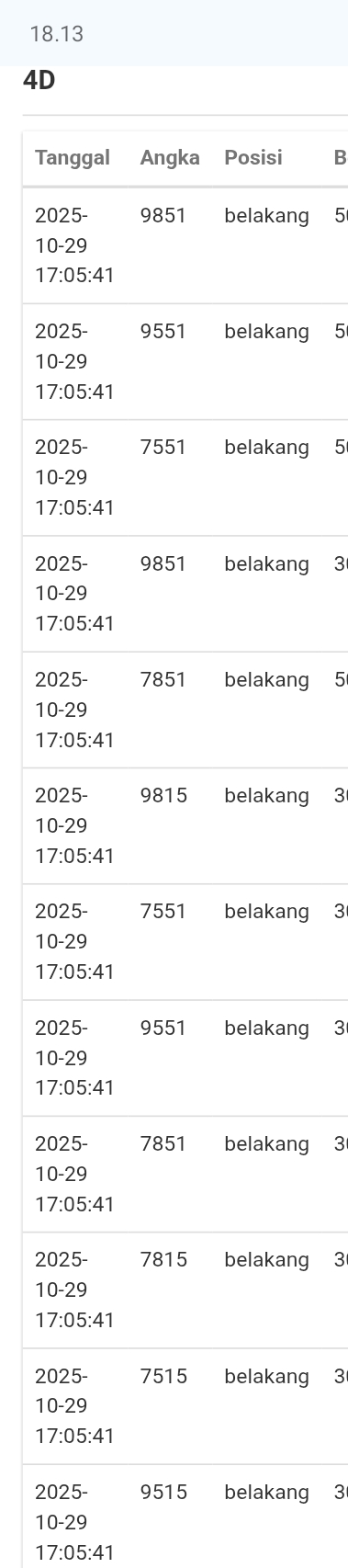 | Rumus Angka Mati berdasarkan kepala harian | 05 06 08 10 15 16 17 18 19 20 21 26 27 28 29 30 32 37 38 39 40 41 43 48 52 53 54 63 64 65 74 75 76 86 87 94 95 97 98 |