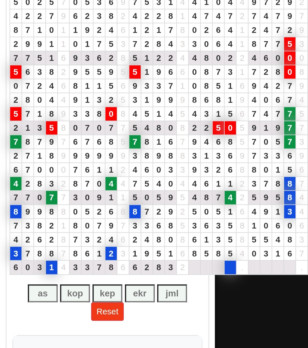 | Rumus Angka Mati berdasarkan kepala harian | 08 09 10 16 17 19 20 27 28 30 31 32 37 38 39 40 41 42 43 48 49 50 51 52 54 59 60 62 63 65 74 75 76 85 86 87 96 97 98 |