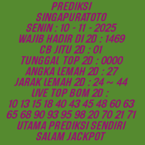 Prediksi Singapore Sabtu, 17-01-2026 Merupakan Prediksi Otomatis yang menggabungkan Metode Kalender Togel Dengan LN Generator yang akurasi prediksinya sudah kita ketahui bersama. Jadi harap Maklum Jika kadang meleset Prediksi Singapore kita. Jadikan ini sebagai perbandingan saja dan tetap Utamakan karya sendiri