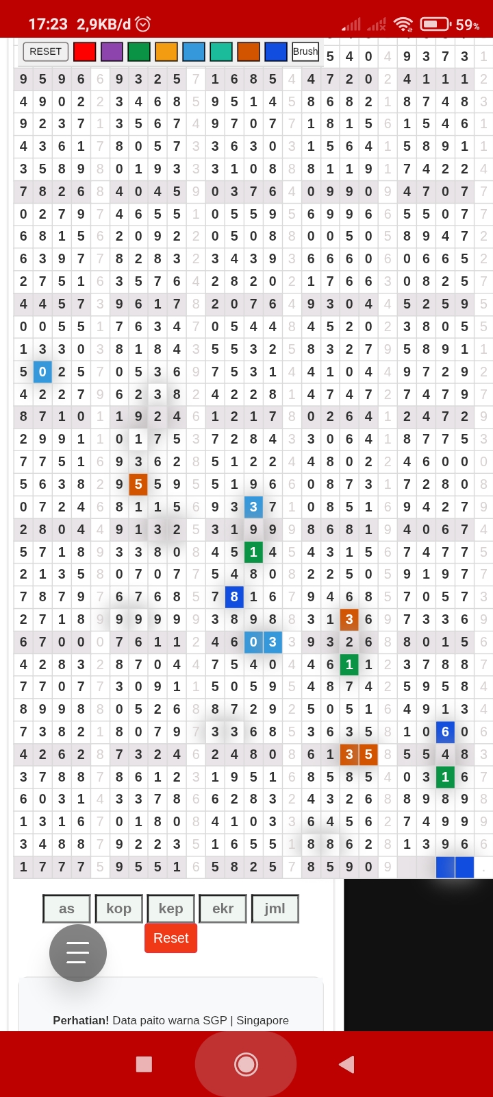 | Rumus Angka Mati berdasarkan kepala harian | 05 06 08 10 15 16 17 18 19 20 21 26 27 28 29 30 32 37 38 39 40 41 43 48 52 53 54 63 64 65 74 75 76 86 87 94 95 97 98 |