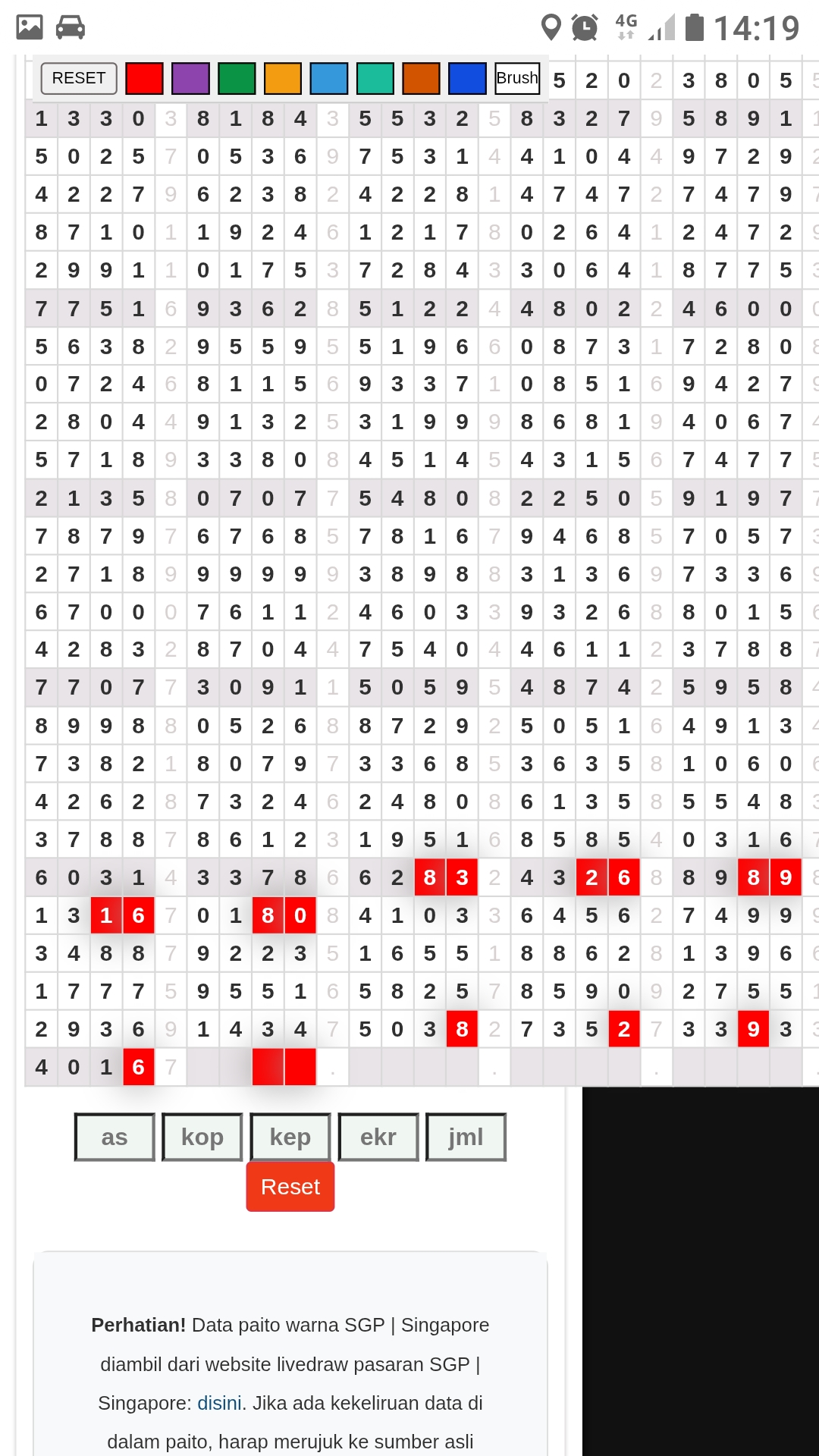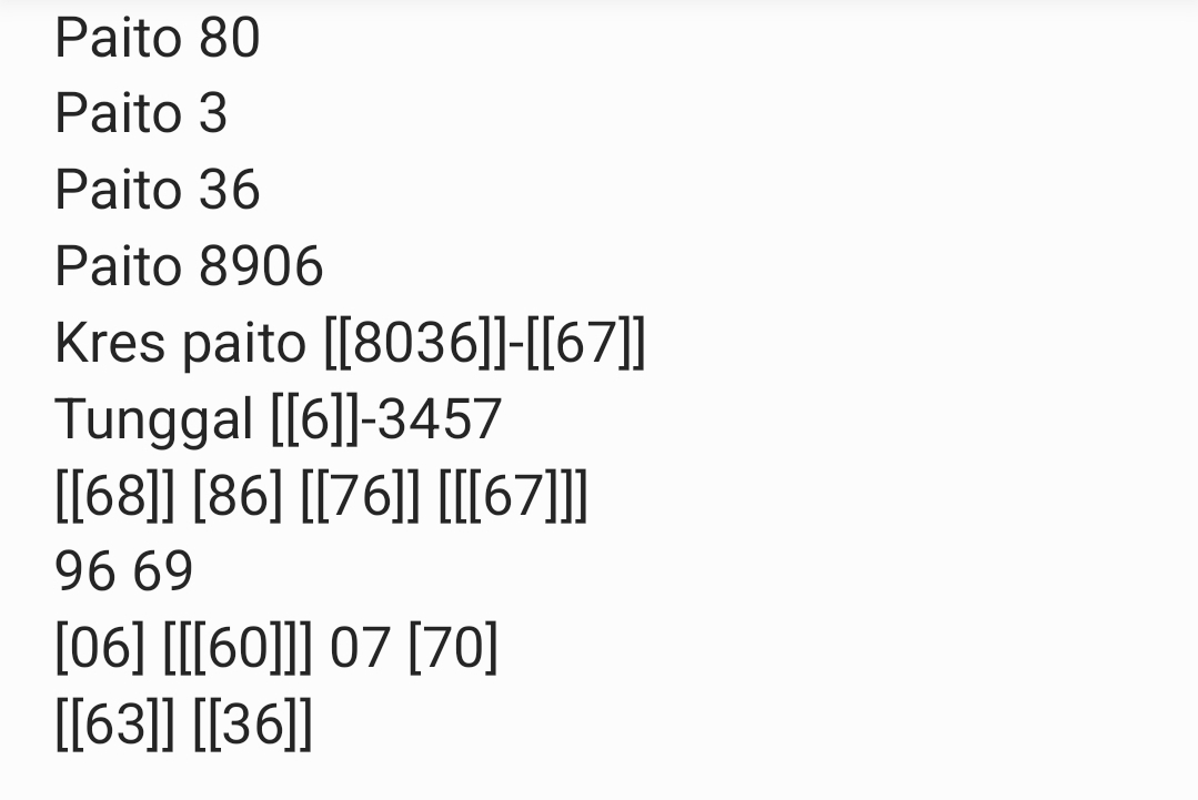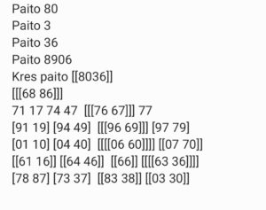 | Rumus Angka Mati berdasarkan kepala harian | 07 08 09 10 18 19 20 21 31 32 38 39 40 42 49 50 51 52 53 54 59 60 61 62 63 64 65 71 72 73 74 76 82 84 85 87 96 97 98 |