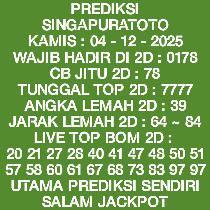 Prediksi Singapore Minggu, 18-01-2026 Merupakan Prediksi Otomatis yang menggabungkan Metode Kalender Togel Dengan LN Generator yang akurasi prediksinya sudah kita ketahui bersama. Jadi harap Maklum Jika kadang meleset Prediksi Singapore kita. Jadikan ini sebagai perbandingan saja dan tetap Utamakan karya sendiri