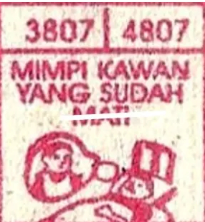 | Rumus Angka Mati berdasarkan kepala harian | 04 05 06 07 09 10 15 17 18 20 21 29 30 31 32 41 42 43 53 54 61 62 64 65 72 73 75 82 83 84 85 86 87 93 94 95 96 97 98 |