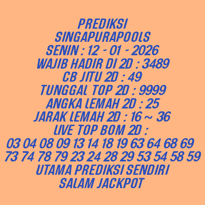 Prediksi Singapore Senin, 12-01-2026 Merupakan Prediksi Otomatis yang menggabungkan Metode Kalender Togel Dengan LN Generator yang akurasi prediksinya sudah kita ketahui bersama. Jadi harap Maklum Jika kadang meleset Prediksi Singapore kita. Jadikan ini sebagai perbandingan saja dan tetap Utamakan karya sendiri